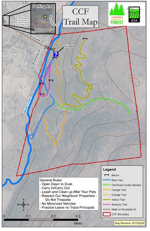 Cell phone service is extremely poor and unreliable at the CCF. We recommend downloading Avenza onto a mobile device before your visit and searching for the Cambridge Community Forest map. The map will work offline and give you accurate GPS positioning while walking in the forest. Avenza is free in both the Apple Store and Google Play.
